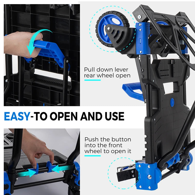 With a simple pull of the handle, you will get a 4-wheel cart or a 2-wheel truck,No tools are required.