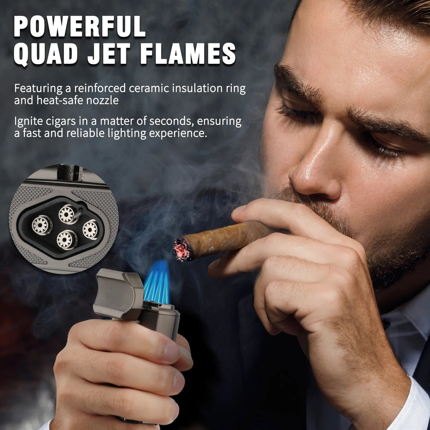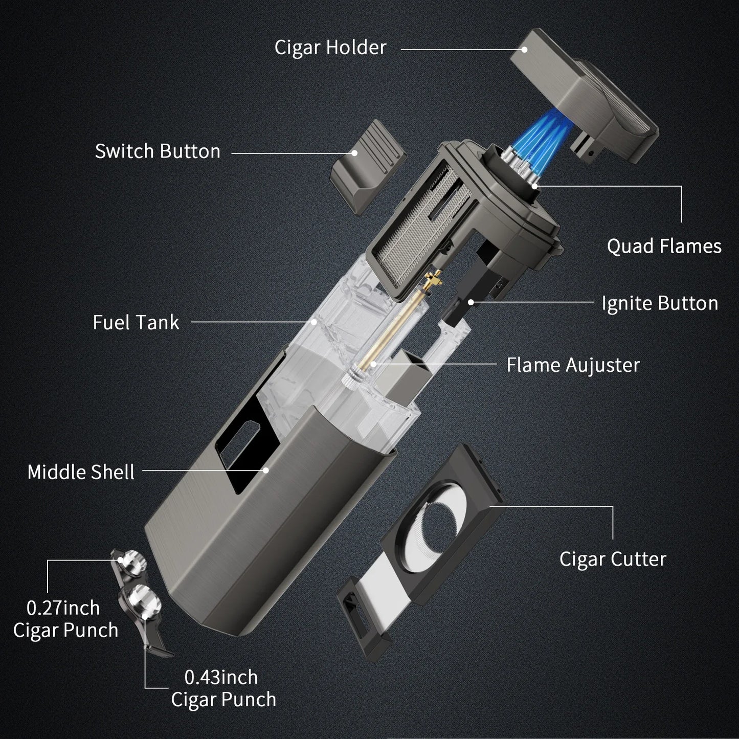 4-in-1 Cigar Accessories: In addition to the cigar cutter and dual cigar punches,this remarkable lighter boasts a hidden cigar holder at the top position;The cigar stand features a diameter of 0.86 inches, providing a secure resting place for cigars up to 60 gauge;With its sleek design and compact size, our quad cigar lighter is the ultimate accessory for indoor and outdoor smoking experiences to elevate your cigar rituals