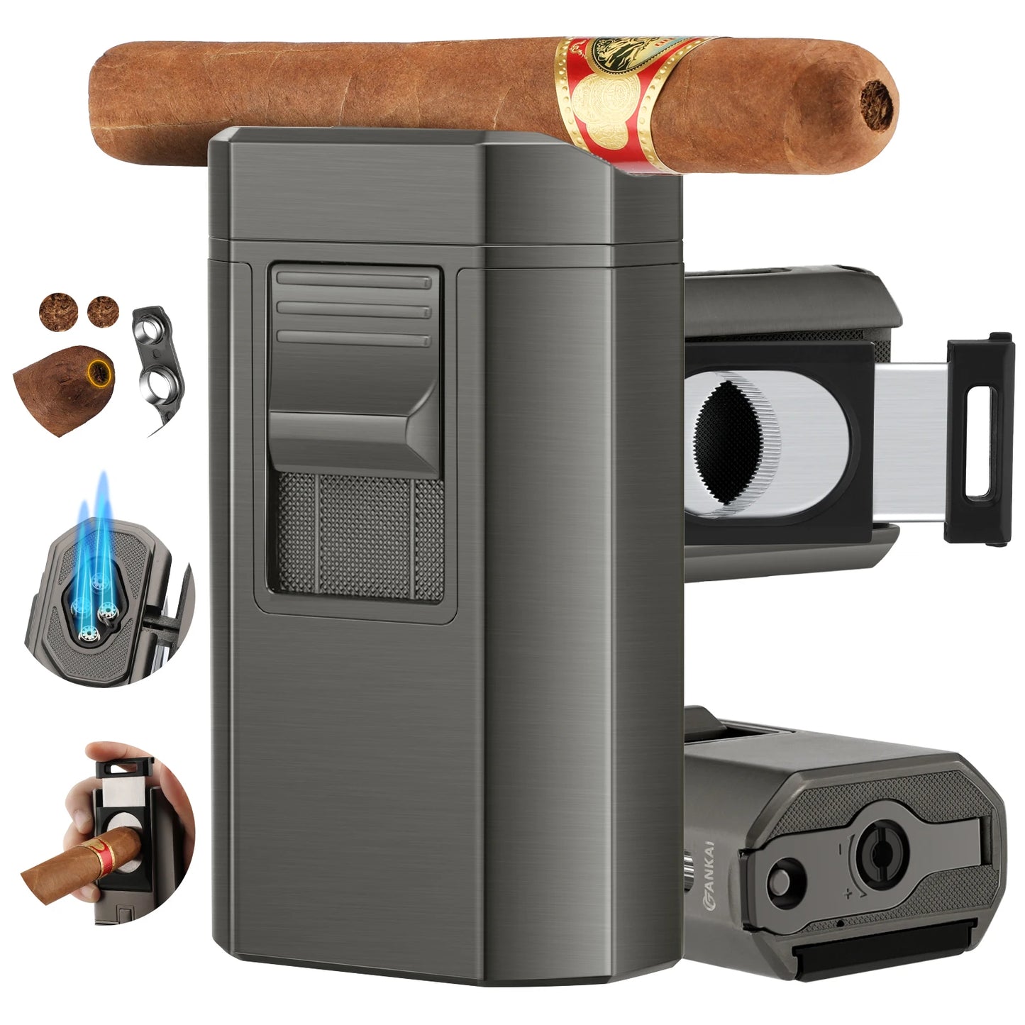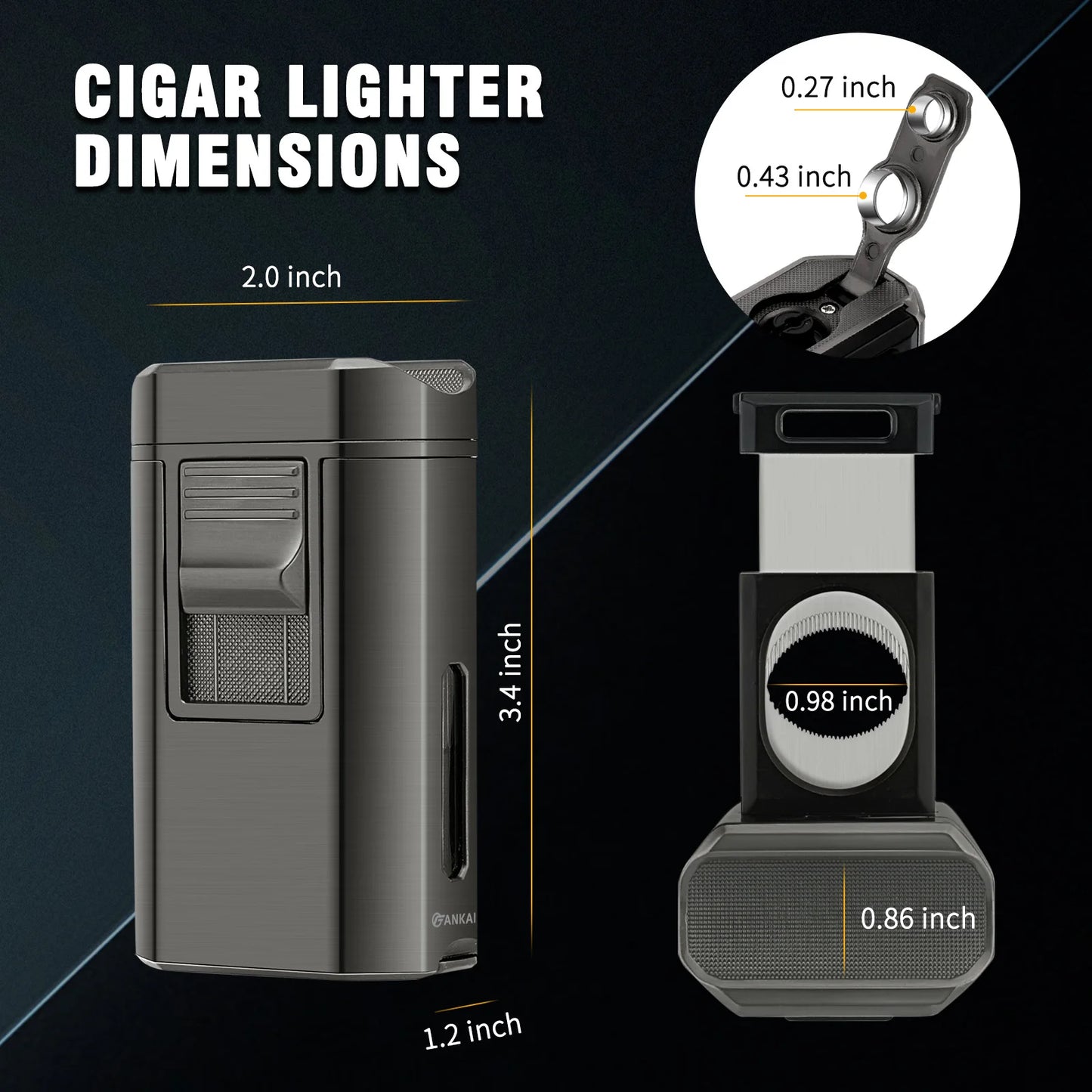 Powerful quad-jet torch lighter: FANKAI cigar torch lighter bundles high technologies to deliver a high performance quad-jet flame,which is specifically designed as a tabletop lighter;Our cigar lighter provide a steady and windproof torch flame with long lasting performance;Four angled jets create an apex of precision engineered flames to concentrate heat and efficiently light any cigar [WITHOUT BUTANE FUEL]