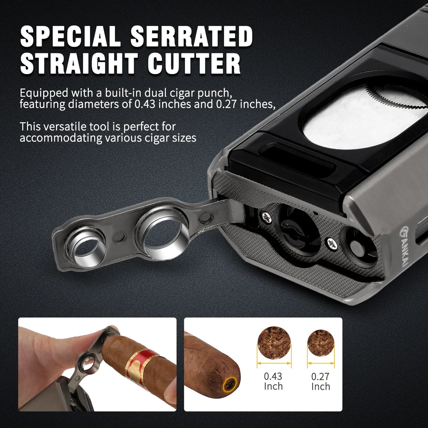 cigar lighter with dual punch built-in: Designed to meet the diverse needs of cigar enthusiasts,this torch lighter eliminates the need for additional cigar accessories by incorporating two cigar punches; With a diameter of 0.43 inches for larger cigars and 0.39 inches for smaller cigars, our lighter ensures a precise and clean cut every time; Elevate your smoking experience with this compact and portable solution that enhances your enjoyment with every cigar