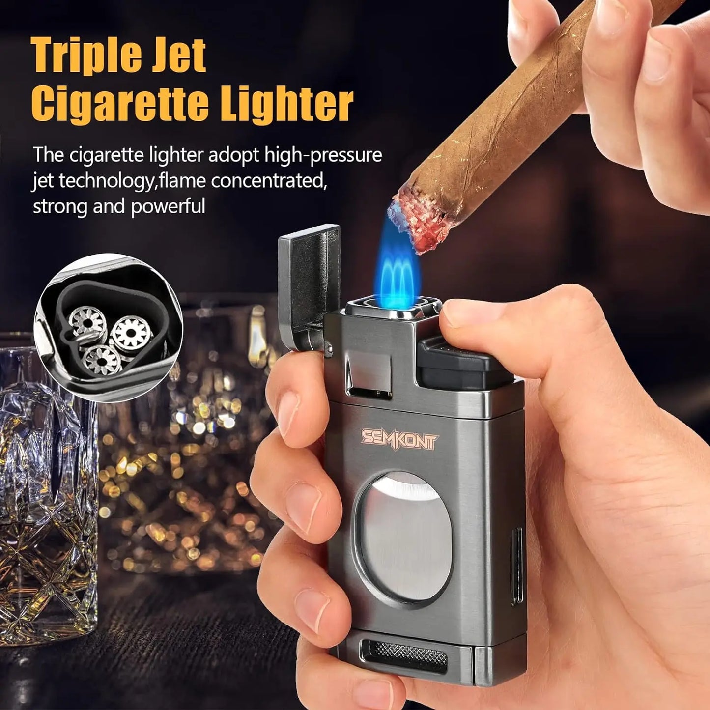 Triple Jet Cigarette Lighter:This cigarette lighter adopt high-pressure jet technology,flame concentrated,strong and powerful.triple jet torch blue flame,can easily light your cigars,enjoy it more quickly.And easy to carry,very suit for camping, travel and hiking in the use of it.