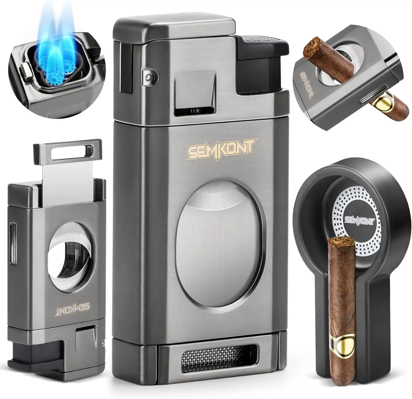 Cigar Lighter Triple Jet Flame Cigar Cutter Windproof Butane Refillable Torch Lighters 2 in 1 Multifunctional Ashtray Set