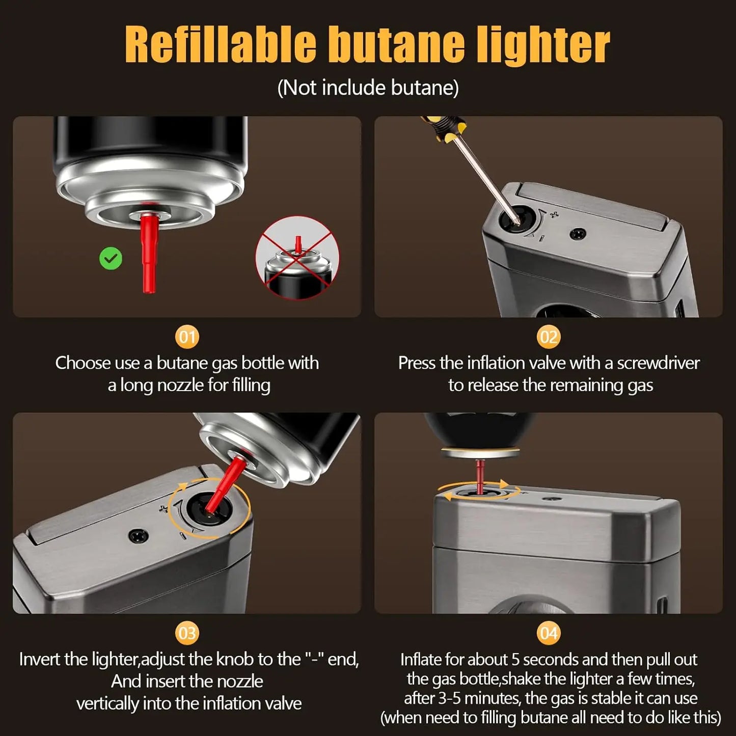 1.2 in 1 cigar lighter,The perfect combination of refillable lighter and straight cut cigar cutter. 2.Triple jet cigar lighter with powerful and concentrated flame,can lights cigars quickly. 3.Even in windy conditions, the windproof lighter can work normally and is not affected at all. 4.Built-in straight cigar cutter, stainless steel sharp blade, easy to cut cigars. 5.Refillable cigar lighter that can be recycled multiple times. 6.Zinc alloy body, non-slip and corrosion-resistant, exquisite craftsmanship, comfortable and beautiful. 7.Cigar cutter suit for most cigars, can cut up to 60 ring gauge cigars. 8.Cigar lighter is easy to operate, light and compact, can be carried around. 9.Comes in a premium gift box, making it a cigar gift worth having. |