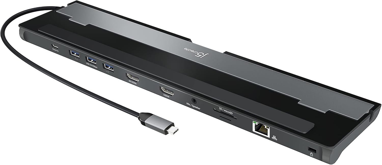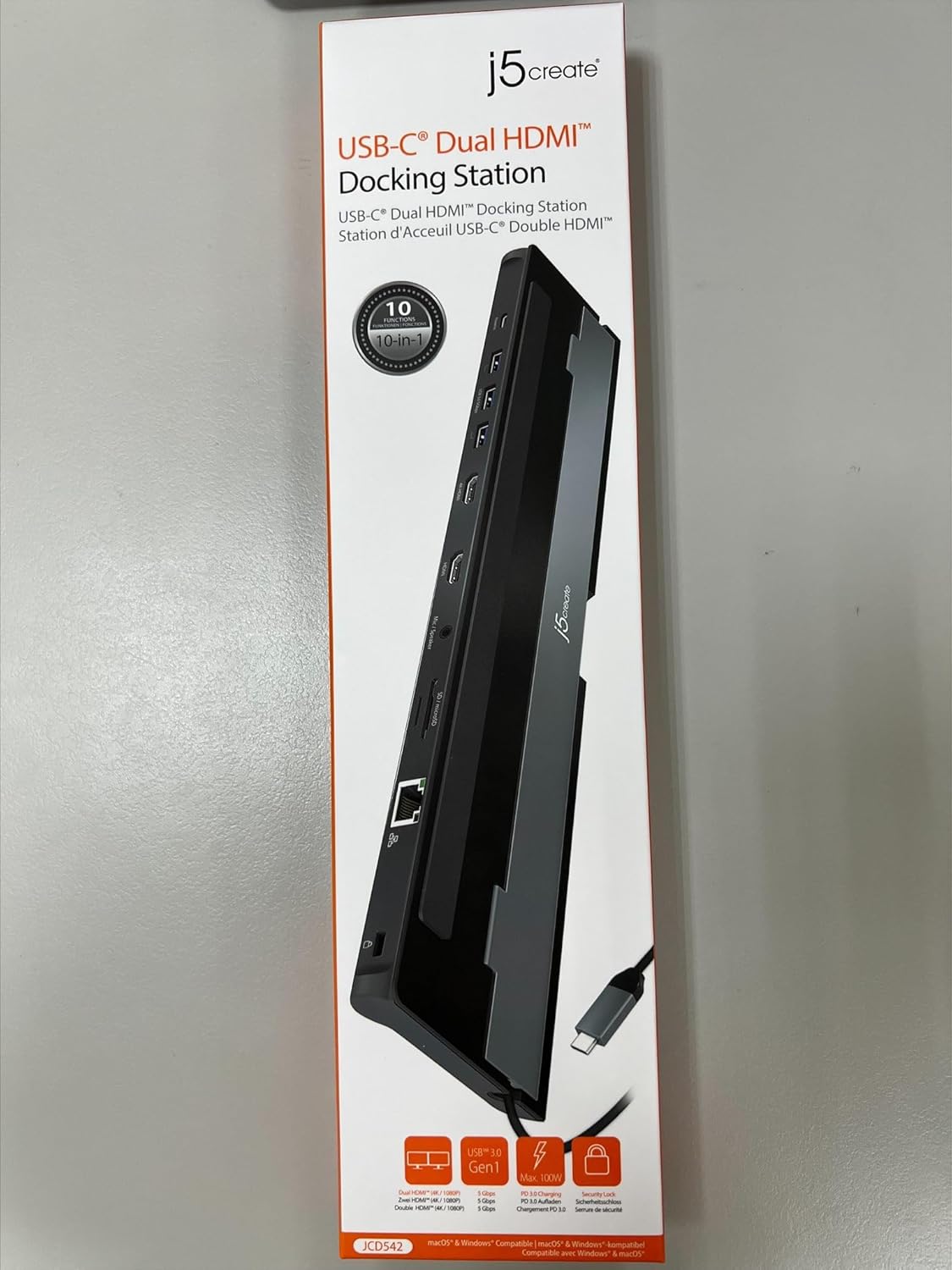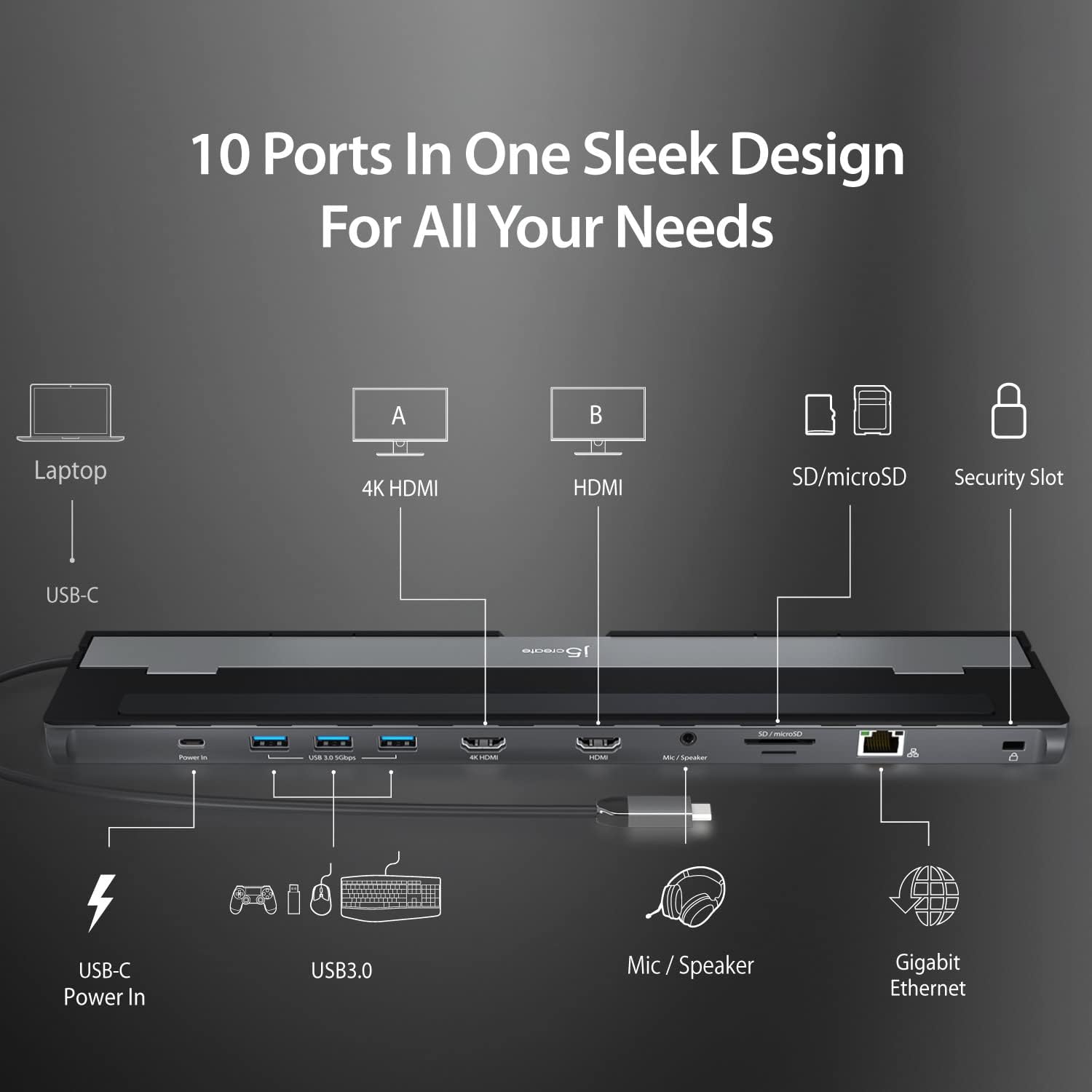 j5create USB-C Dual HDMI Docking Station (10-in-1), 4K + 1080p Dual HDMI Display, 5Gbps USB-A x3, SD Card Reader, PD 100W, RJ45 Ethernet, Combo Audio Jack, for MacBook and Windows Laptop (JCD542)