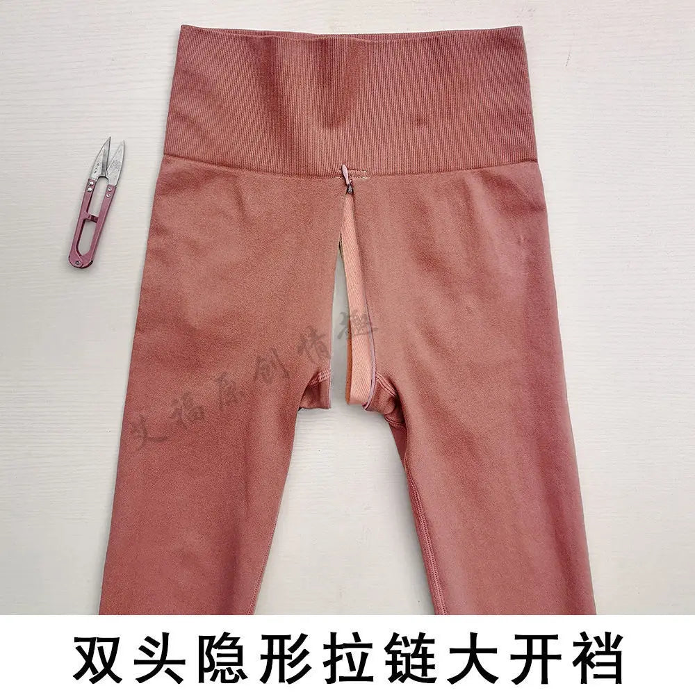 Knitted Autumn Outdoor Open Crotch Women's Peach Hip Sports Leggings Invisible Zipper Workout Pants Tight Sexy Gym Trousers