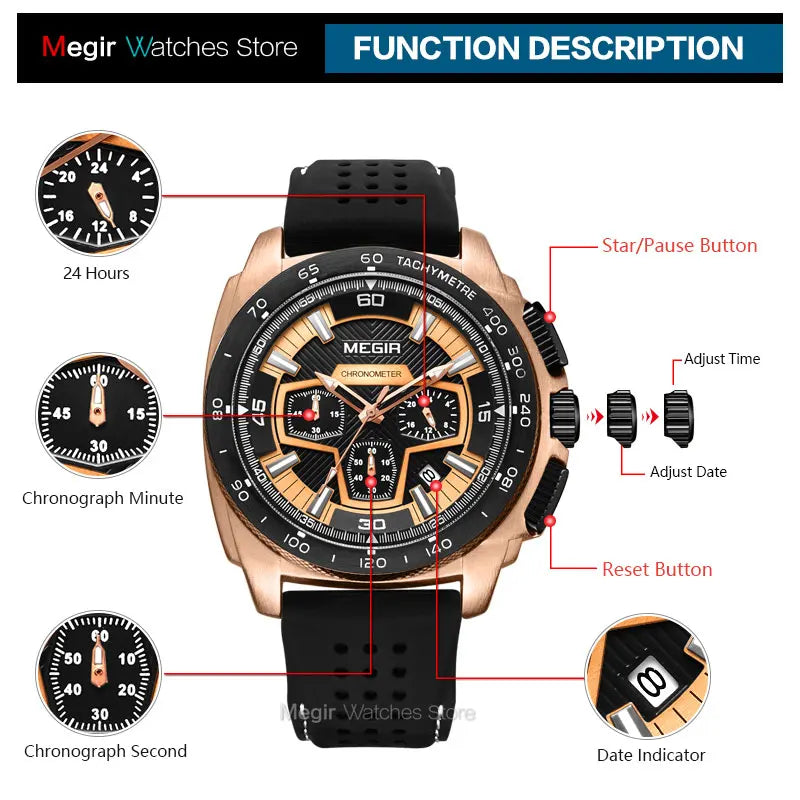 Megir Males Mens Chronograph Sport Watches with Quartz Movement Rubber Band Luminous Wristwatch for Man Boys 2056G-1N0