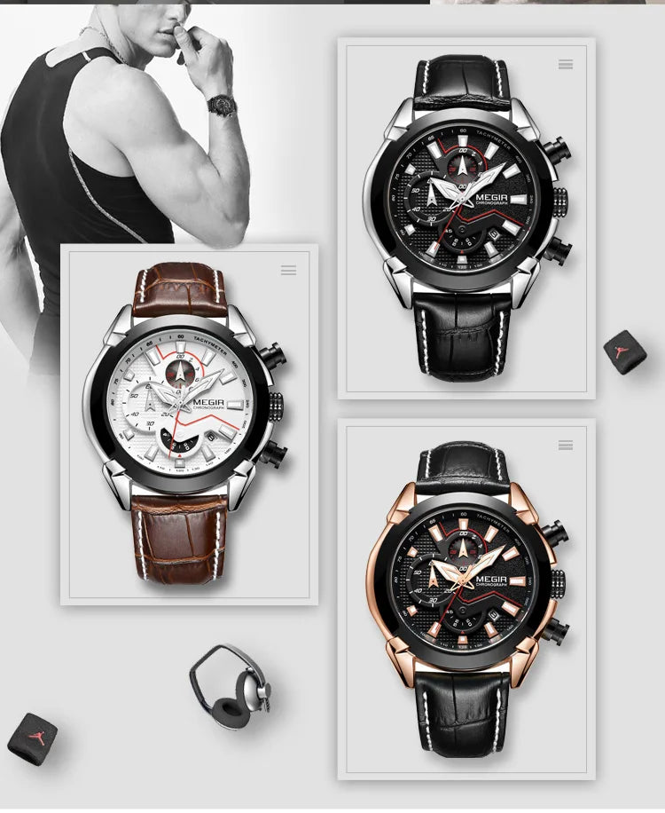 MEGIR Military Sport Watch for Men Top Brand Luxury Watches Leather Strap Quartz Wristwatch Man Clock Chronograph Reloj Hombre