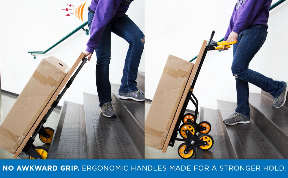 Whether it's hauling heavy cargo on stairs or bringing home the groceries, make transport easy with Mount-It! Folding Stair Climber Hand Truck. Designed with heavy duty tri-wheels, this cart glides up and down easily on stairs, curbs or any uneven surface. Ergonomic handles prevent awkward grips and back injury. Folds down easily without tools for easy transport and storage in vehicles, storage rooms, garages, etc.