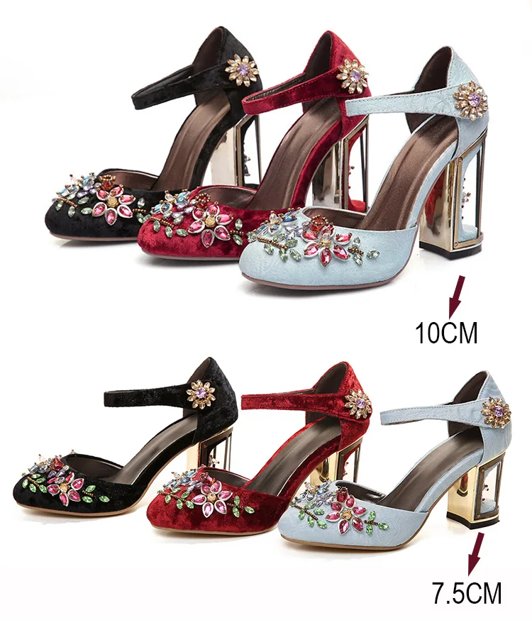 Phoentin crystal flower mary janes women pumps shoes strange high heels 10cm hook & loop handmade rhinestone wedding shoes FT028