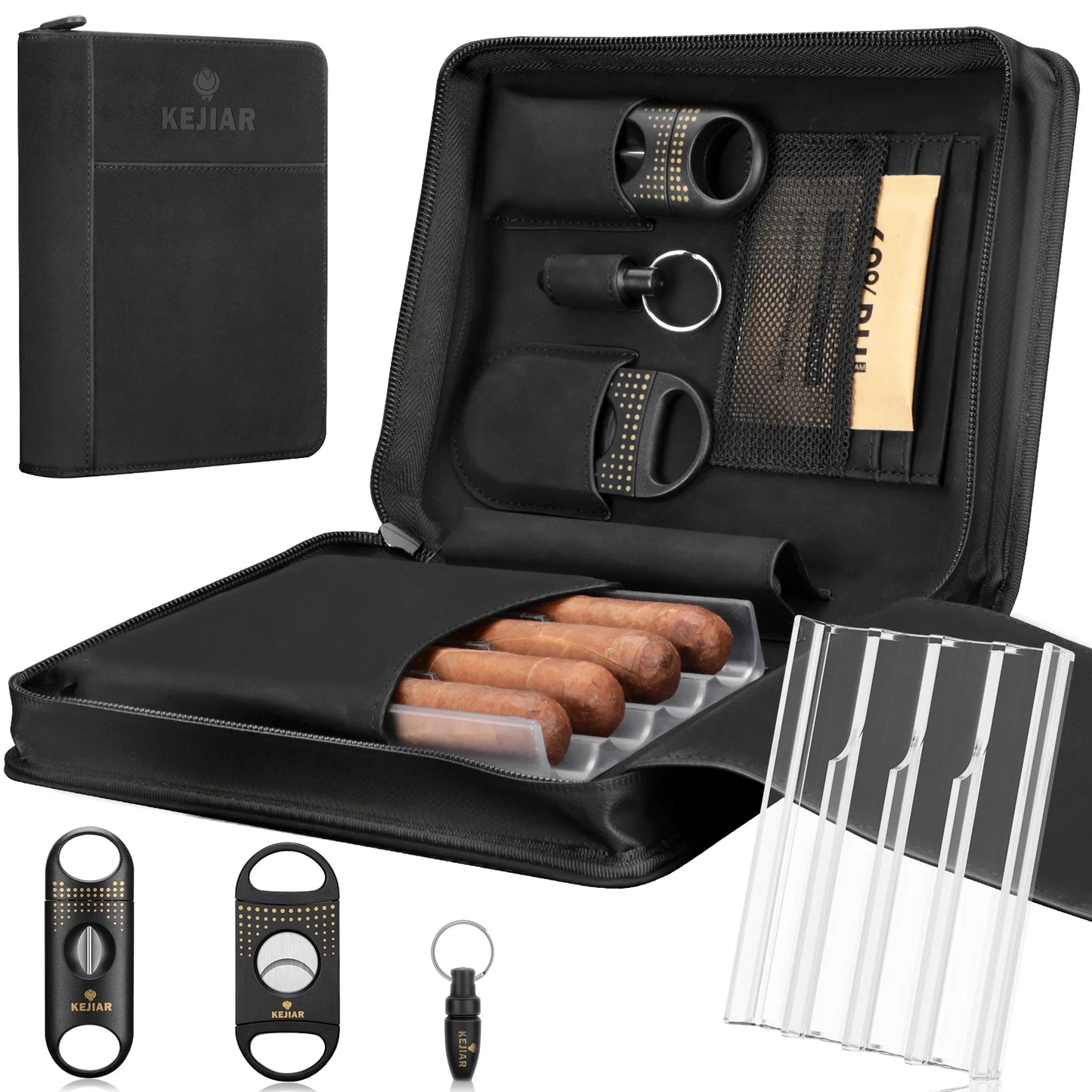 【With Practical Cigar Accessories】KEJIAR travel cigar case is specially designed to integrate cigar accessories into its lining seamlessly. It features a SHARP V CUT CIGAR CUTTER with a 0.7'' diameter and a STRAIGHT CUT CIGAR CUTTER with a 0.94'' diameter, catering to different cigar cutting preferences, the cutter ensure accurate and quick cuts without damaging your cigars. The CIGAR PUNCH has a 0.31'' diameter providing a clean and neat cut everytime, adds extra convenience for cigar lovers.