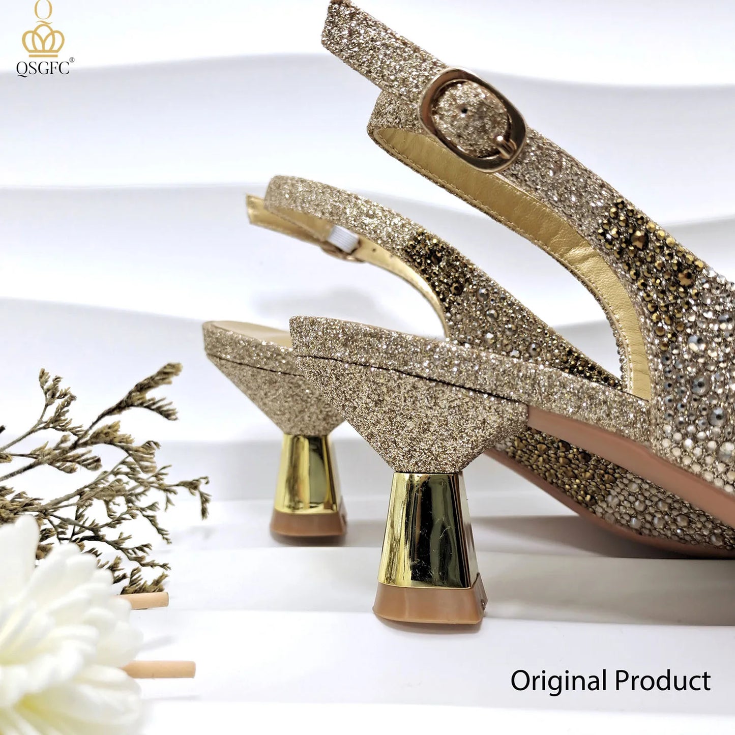 QSGFC INS 2024 Gold Color Elegant Women Heels Shoes and Bag Set Hollow Rhinestones High Heels Wedges Shoes Matching Bag