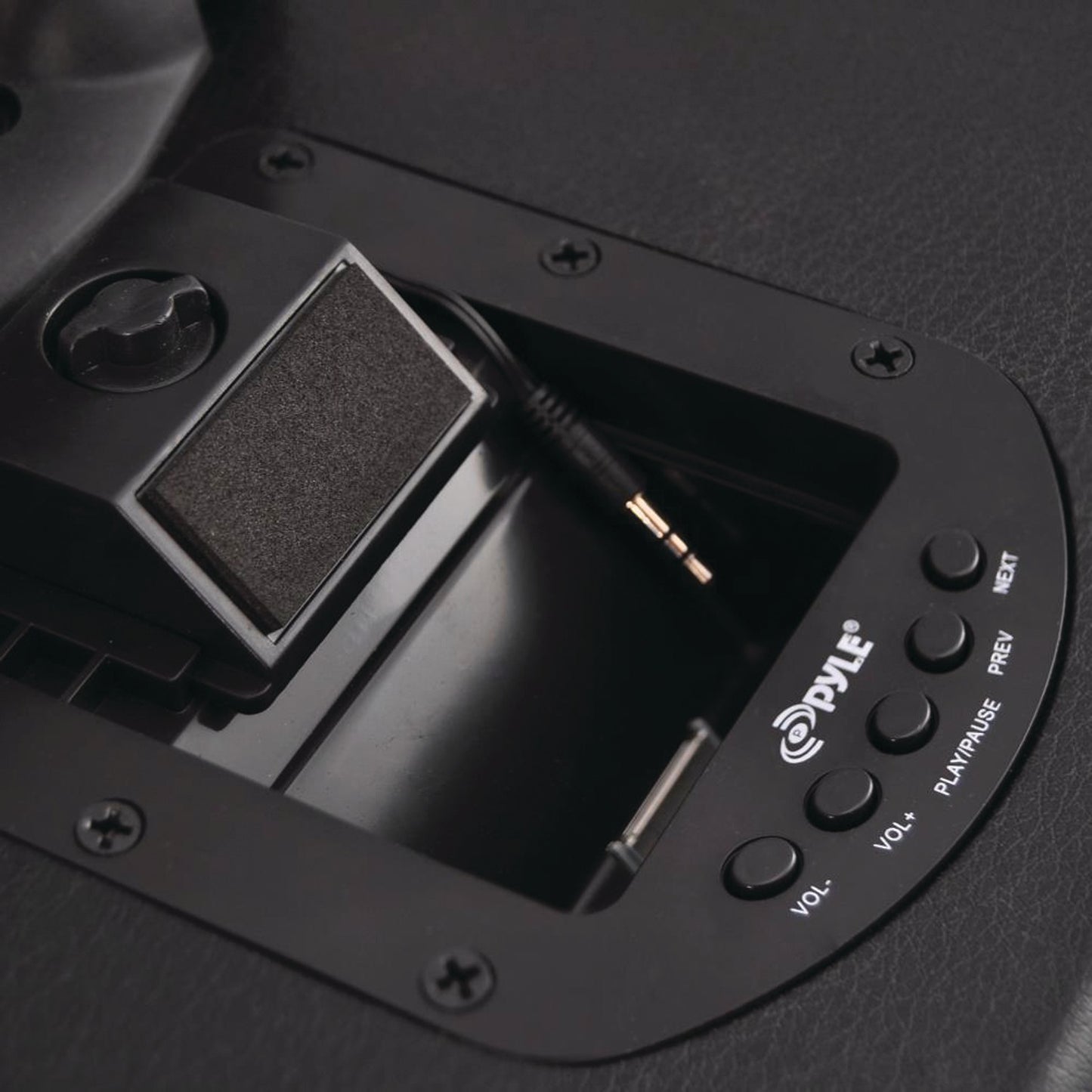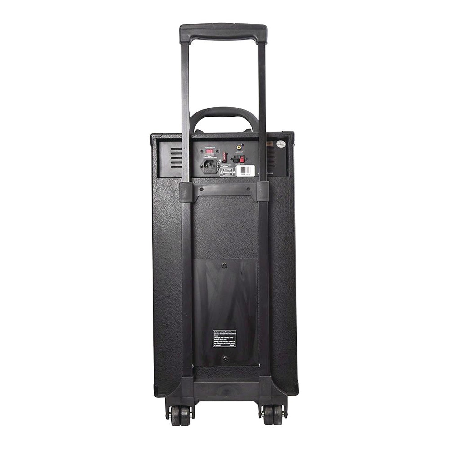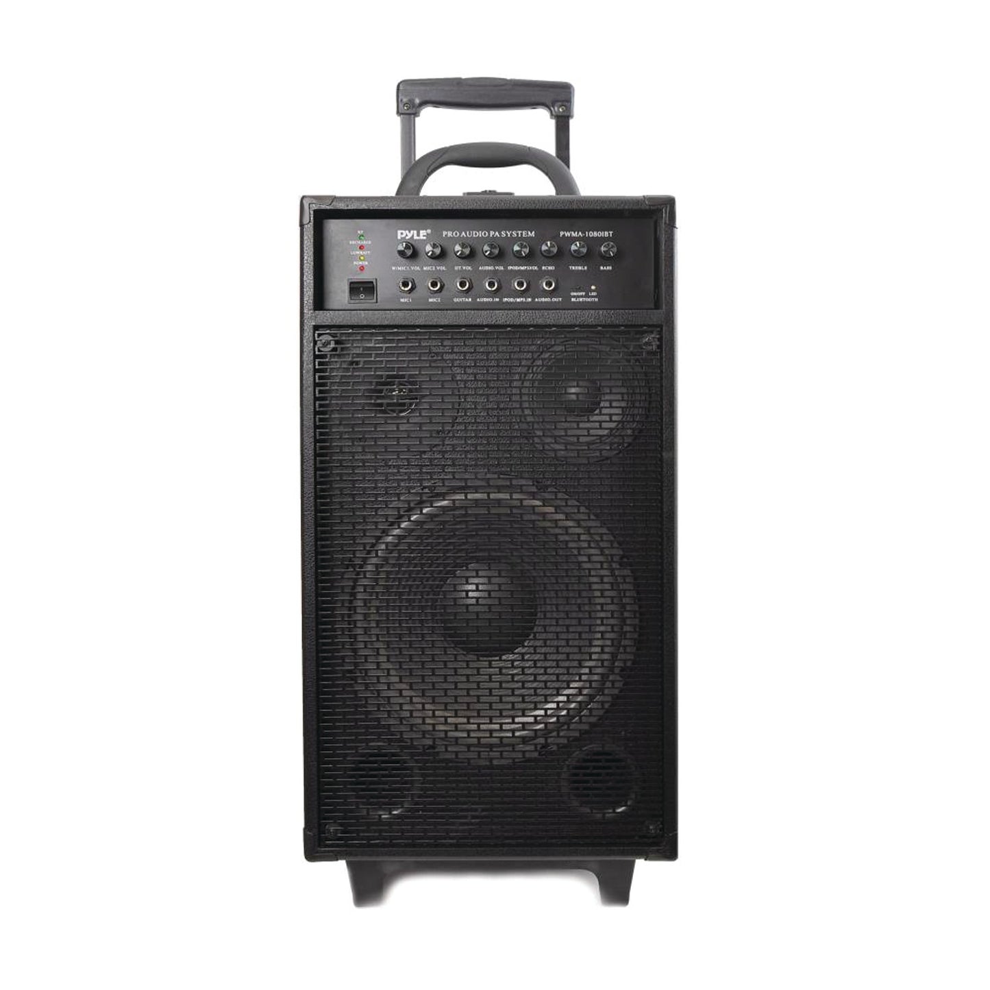 • Bluetooth(R) connectivity;• iPhone(R), Android(TM), smartphone, iPad(R), tablet, computer compatible;• Built-in rechargeable battery & 30-pin iPod(R) dock connector;• Two 1/4" microphone inputs & three 1/4" guitar/instrument inputs;• Connects & streams audio from external devices;• 10" subwoofer, 4" midrange & 4" tweeter;• Wireless microphone;• Connects up to 3 microphones;• 35mm speaker stand mount;• LED indicator lights;• External 12V power DC input connector;• Includes microphone, 3.5mm audio cable & adapter, battery clamp cables, RCA connection cable & power cable;