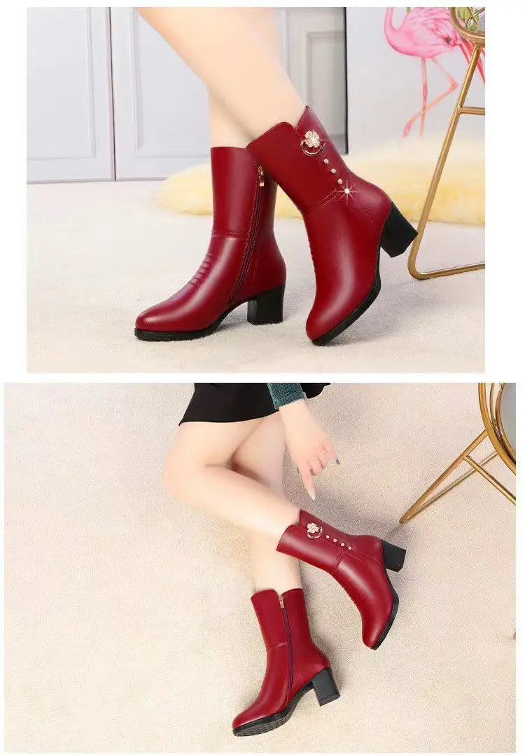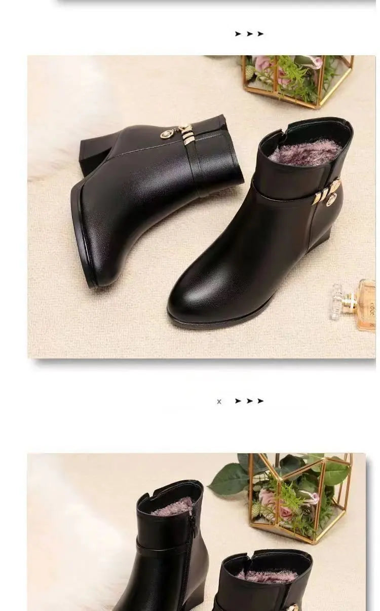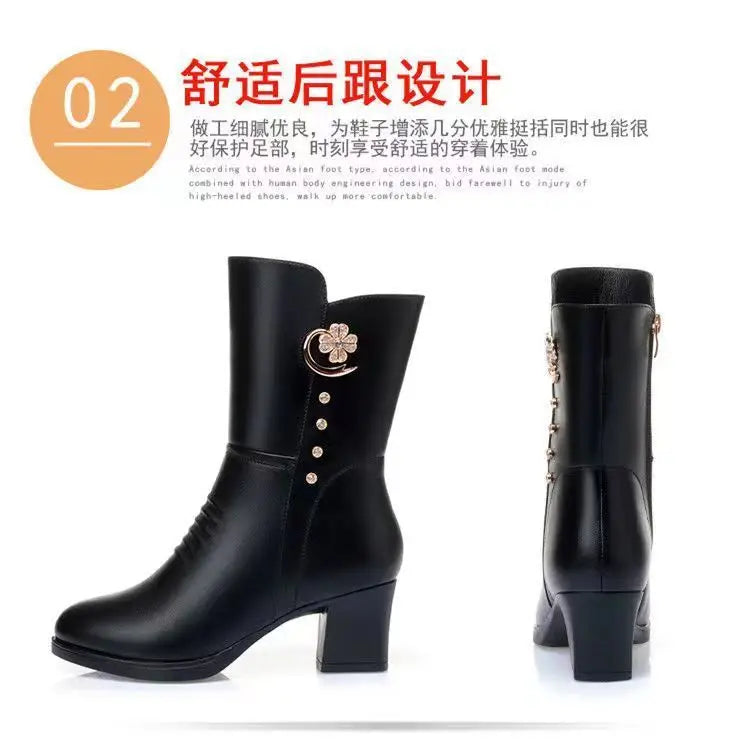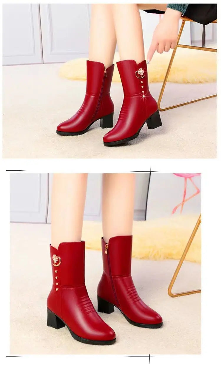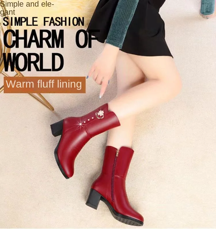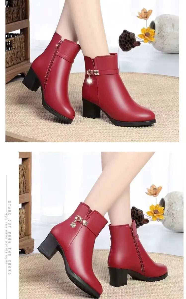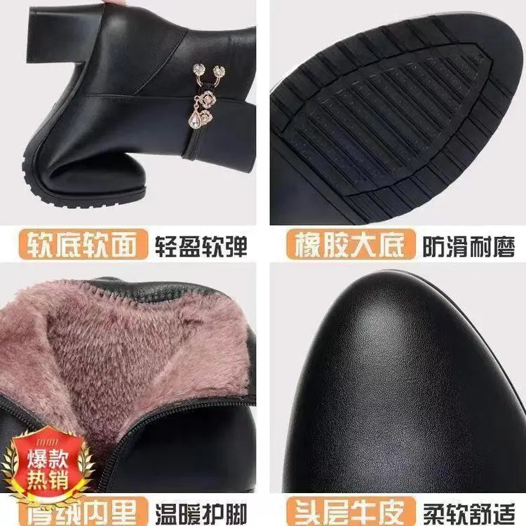 Soft Leather Ankle Boots for Women Spring Winter with Plush Warm Side Zipper Round Toe High Heel Lady Boots Casual Mom Shoes