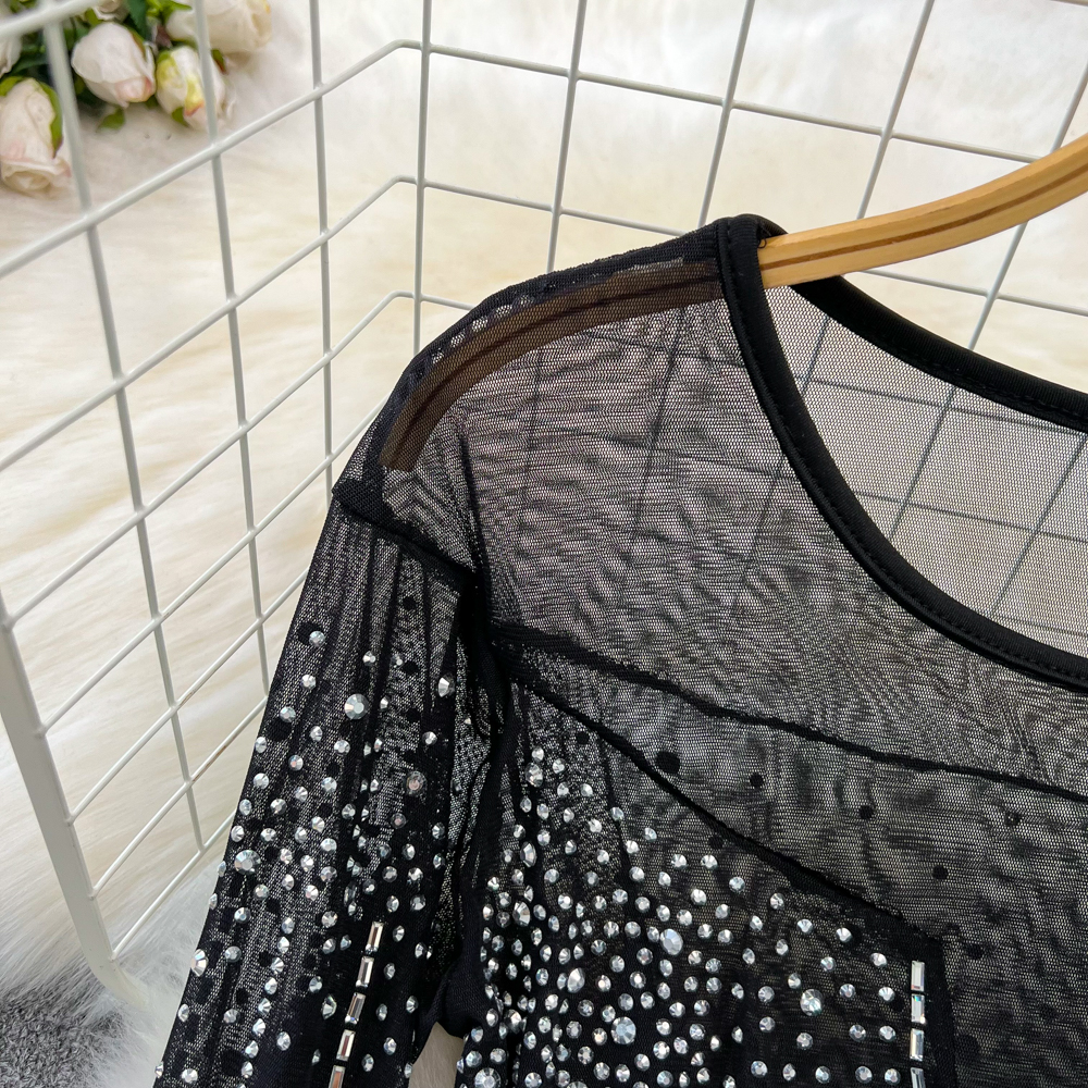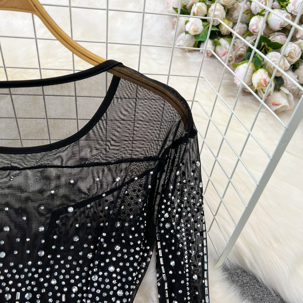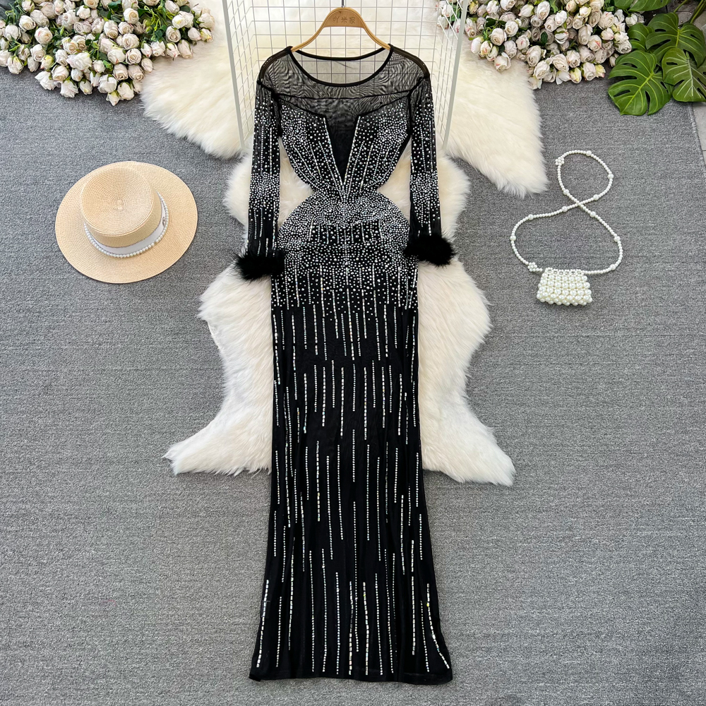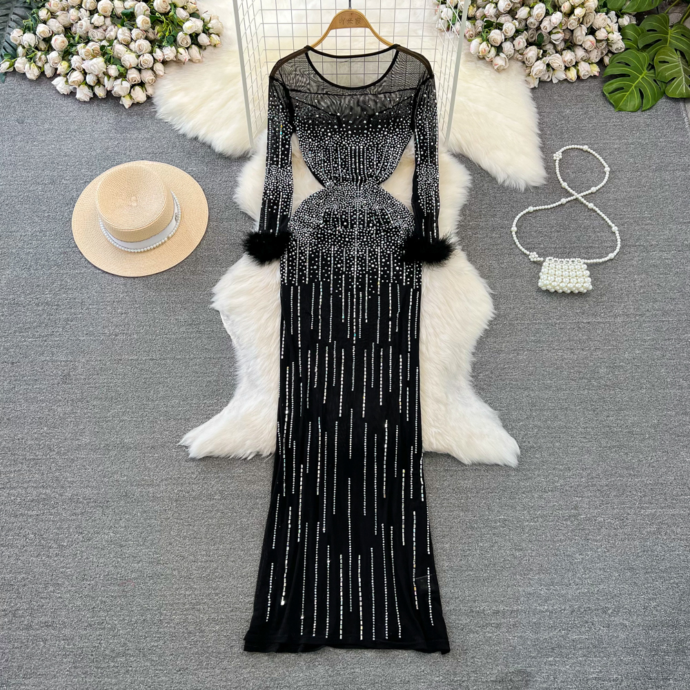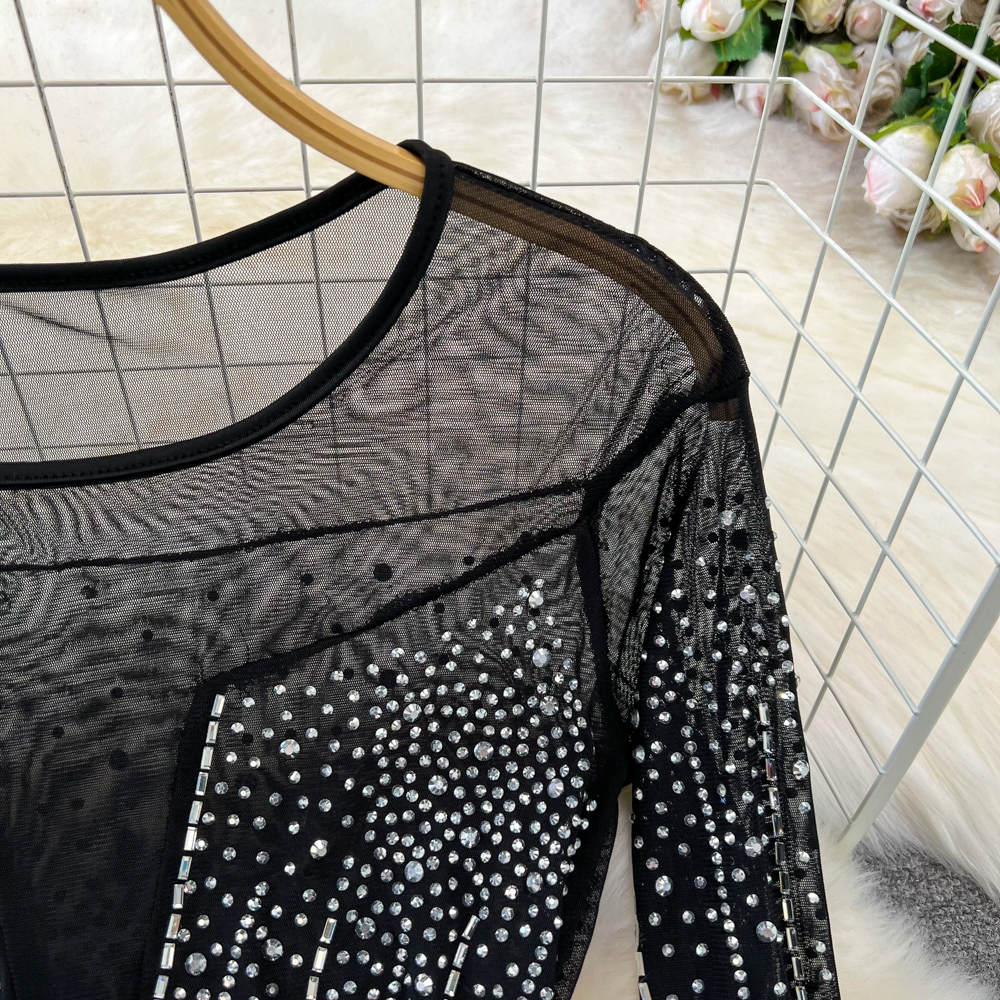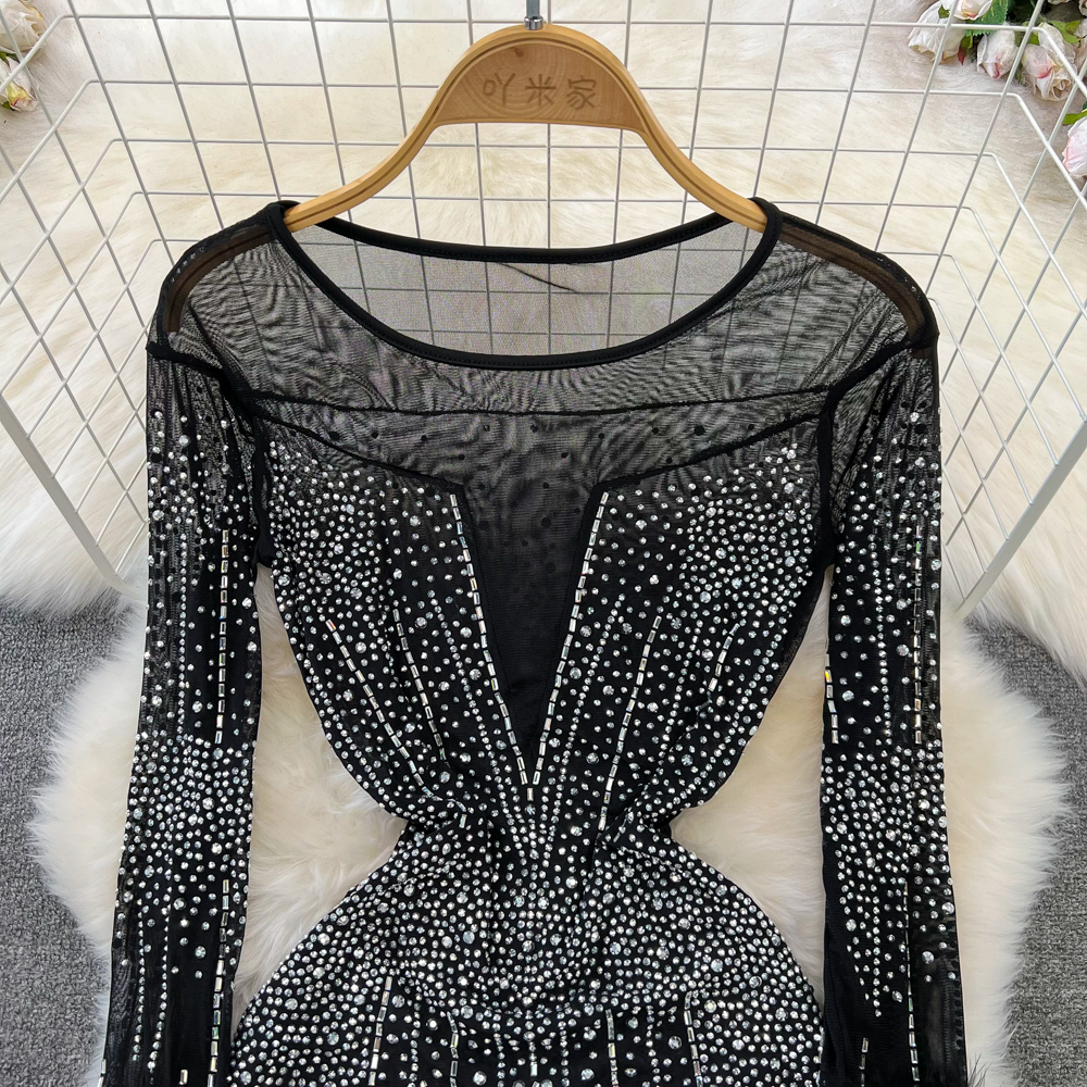 Spring and Autumn Fashion Sexy Long Sleeves round Neck Waist Trimming Slim Looking Mid Length Long Length Mesh Hot Drilling Perspective Hip-Wrapped Dress Dress