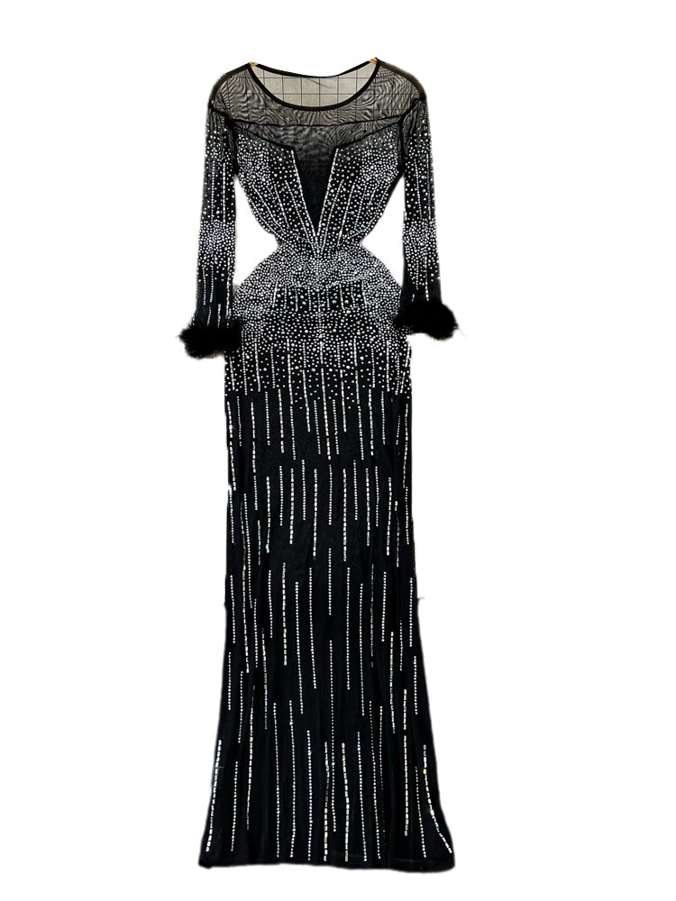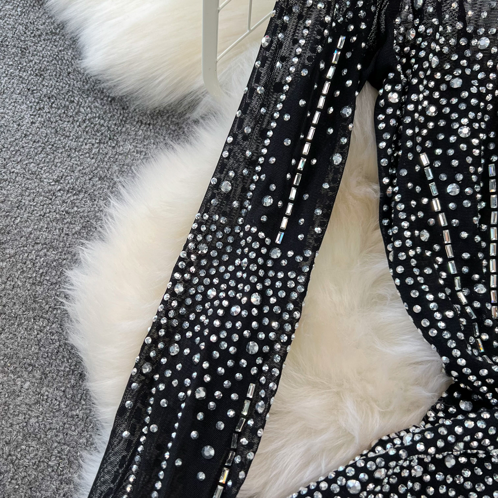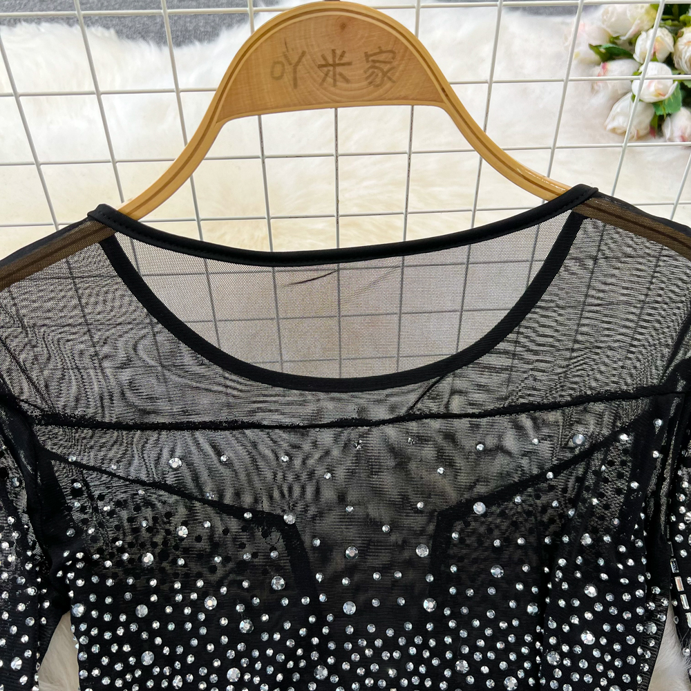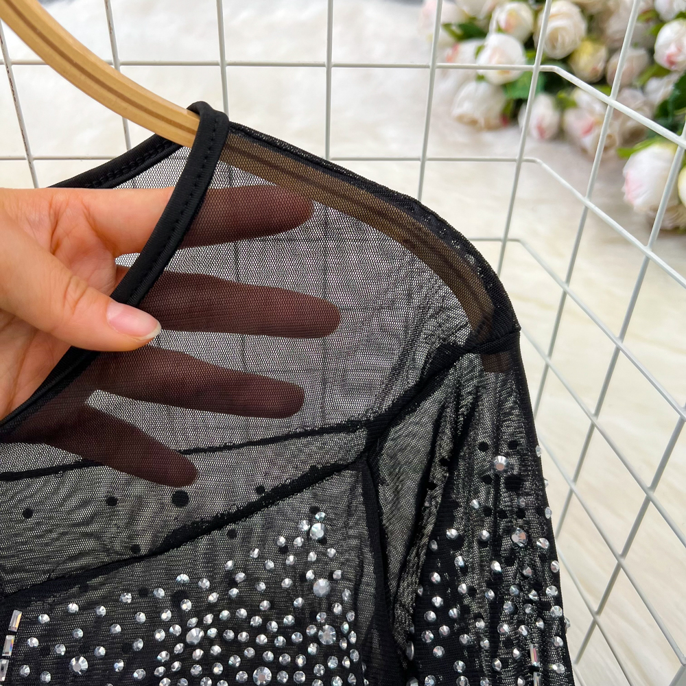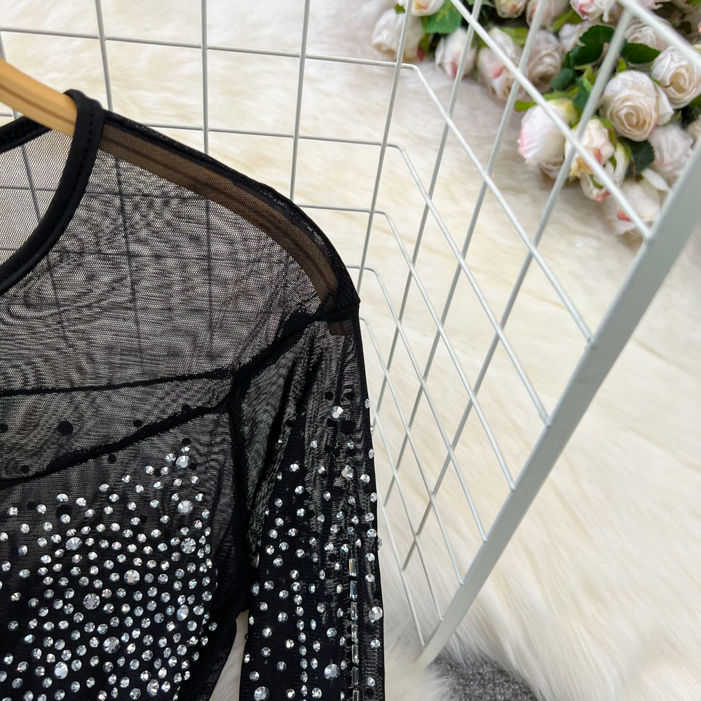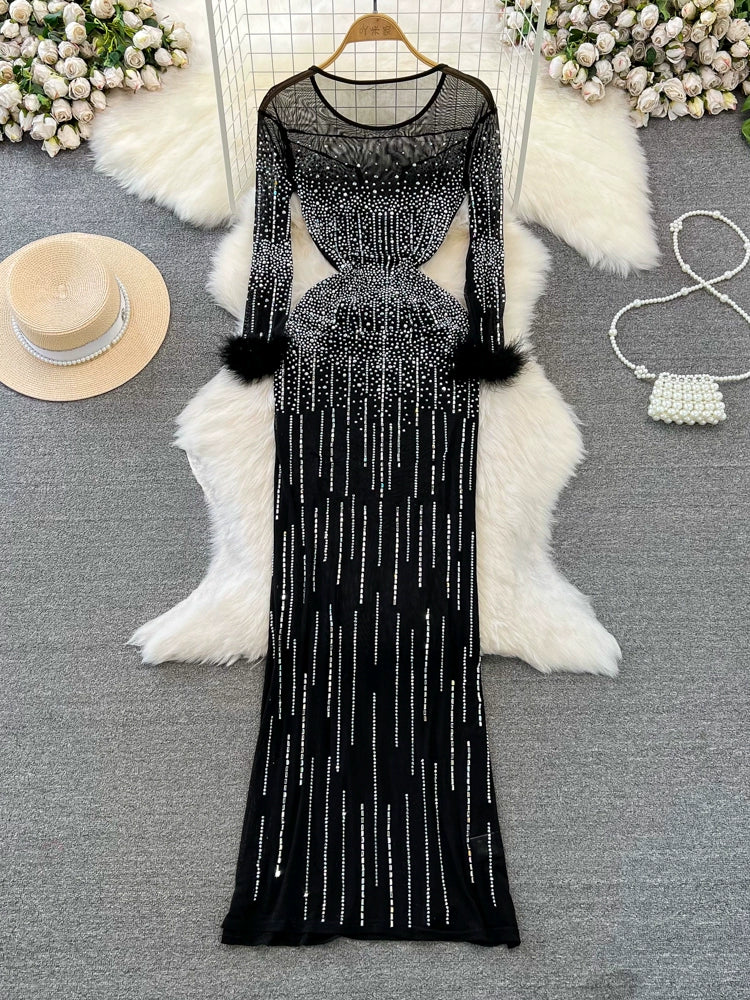 Spring and Autumn Fashion Sexy Long Sleeves round Neck Waist Trimming Slim Looking Mid Length Long Length Mesh Hot Drilling Perspective Hip-Wrapped Dress Dress