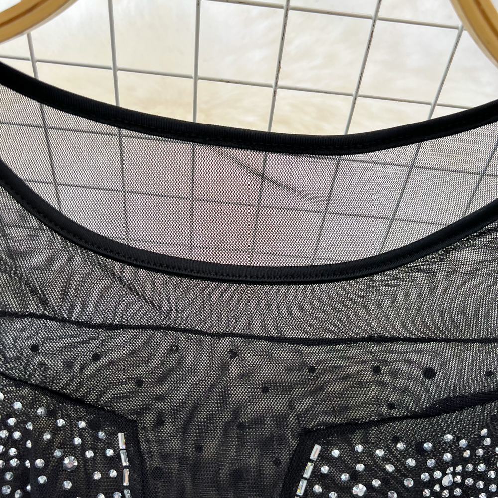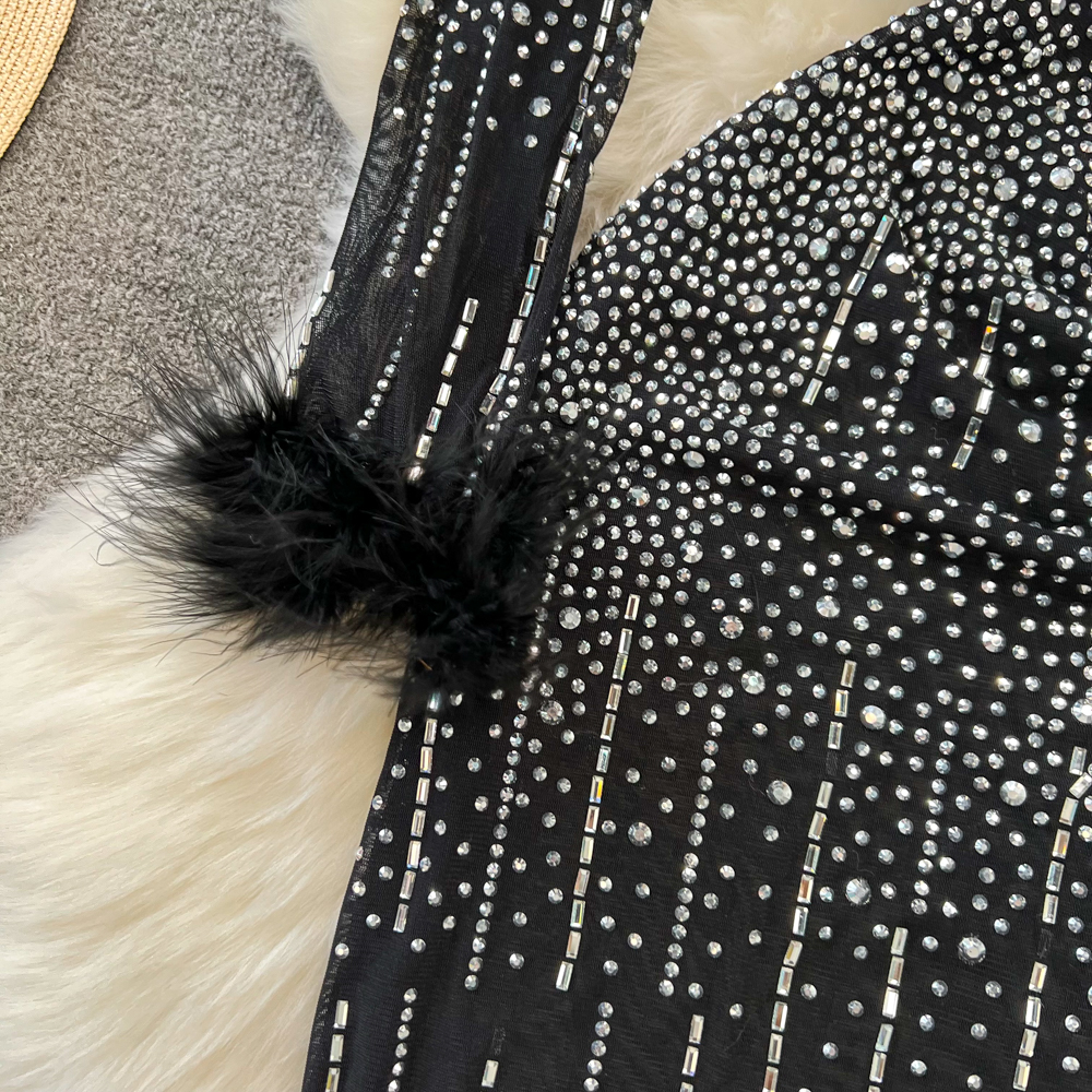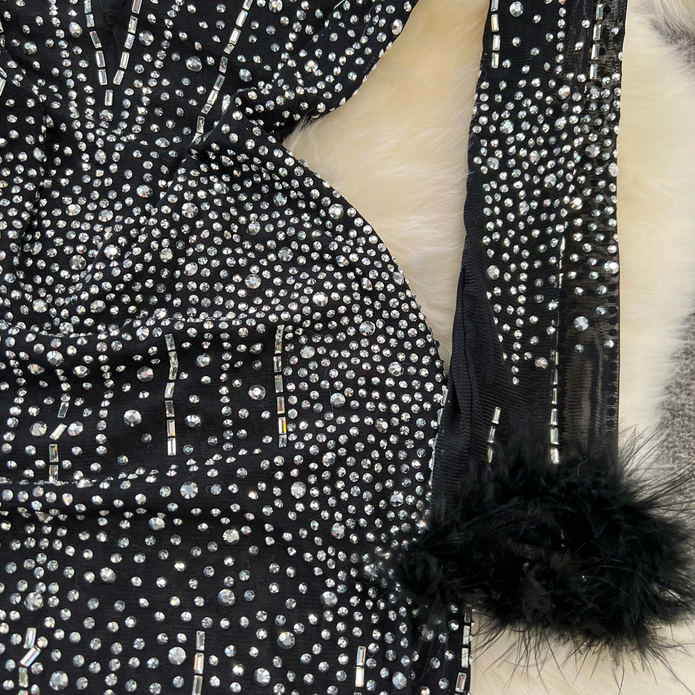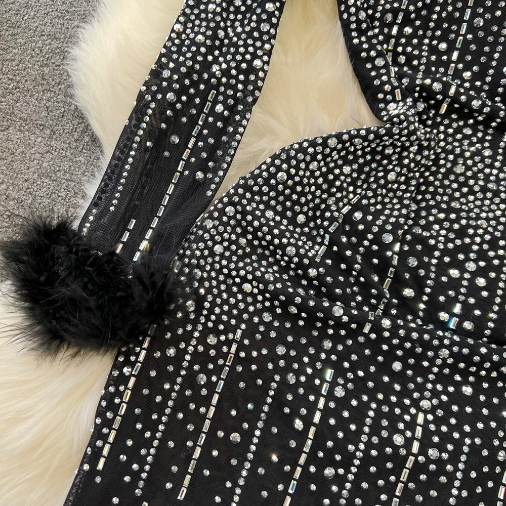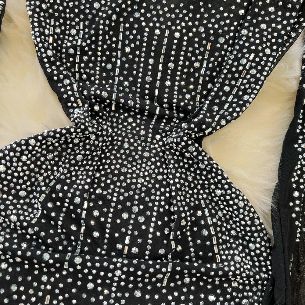 Spring and Autumn Fashion Sexy Long Sleeves round Neck Waist Trimming Slim Looking Mid Length Long Length Mesh Hot Drilling Perspective Hip-Wrapped Dress Dress