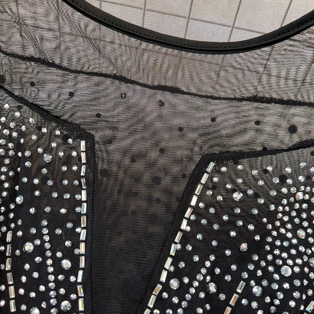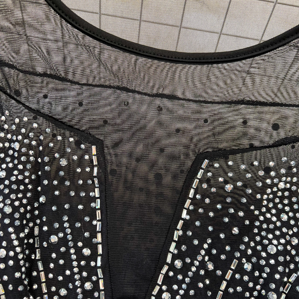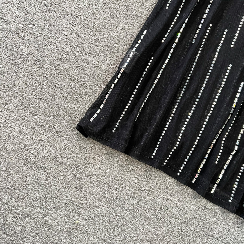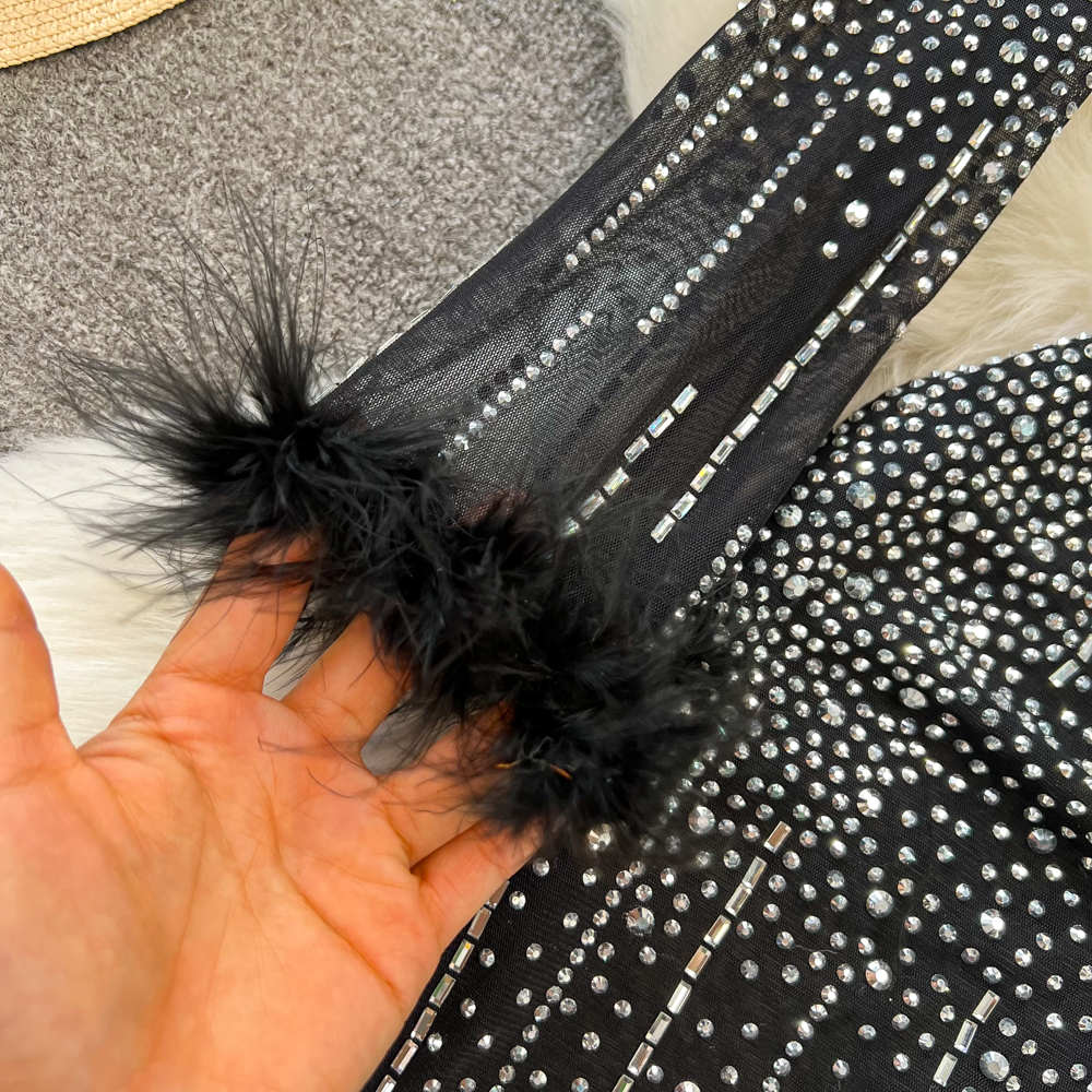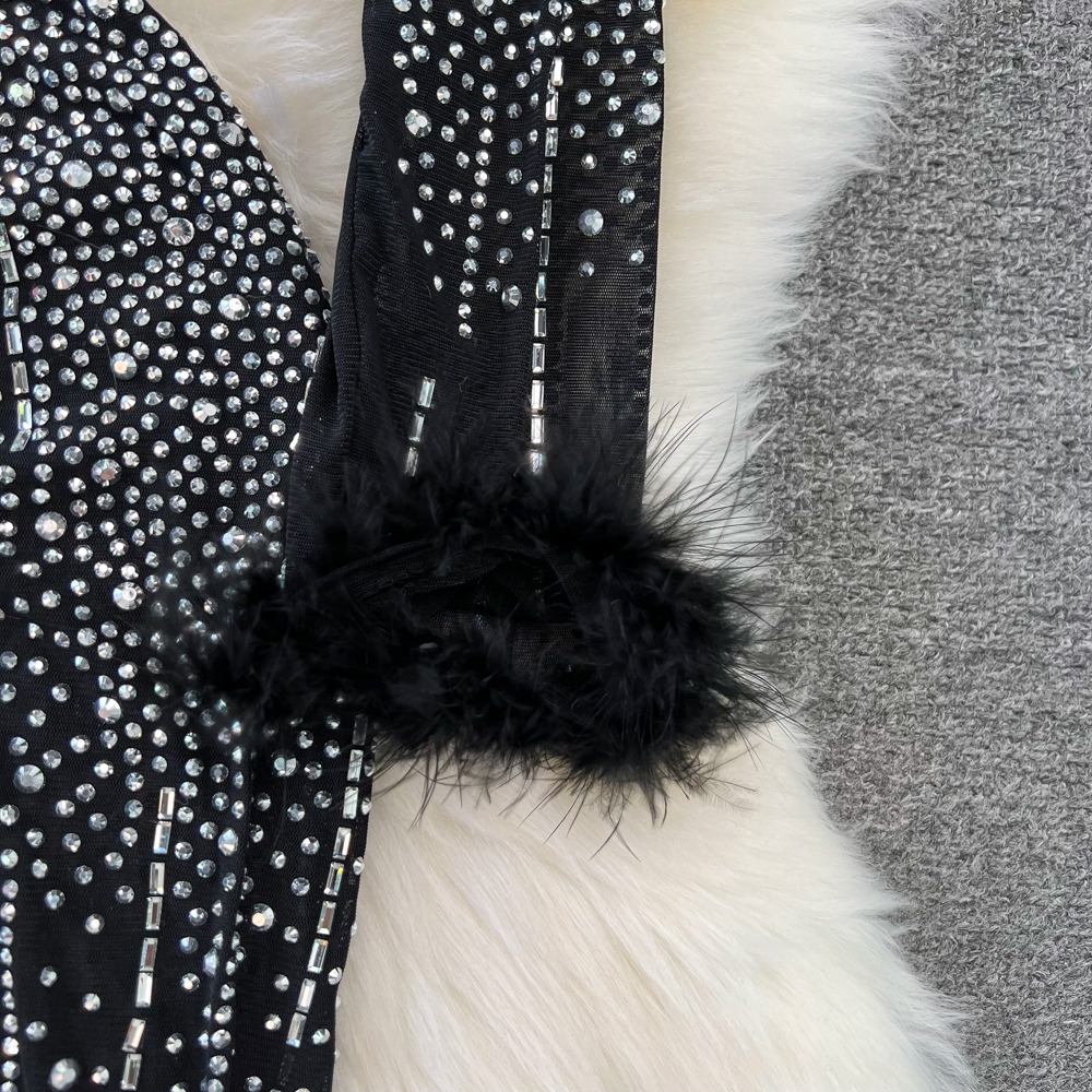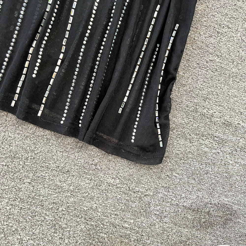 Spring and Autumn Fashion Sexy Long Sleeves round Neck Waist Trimming Slim Looking Mid Length Long Length Mesh Hot Drilling Perspective Hip-Wrapped Dress Dress