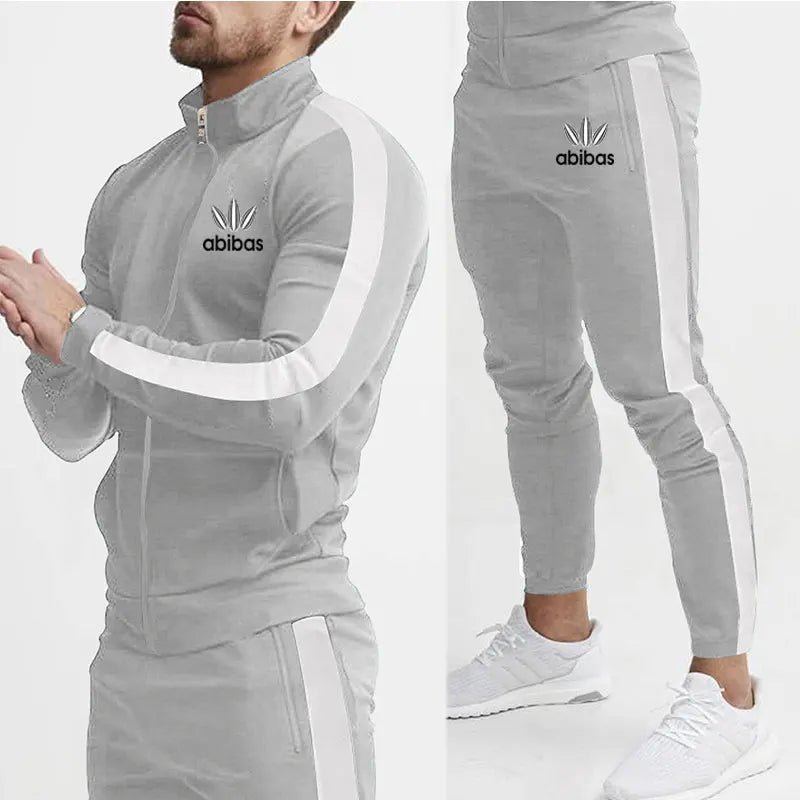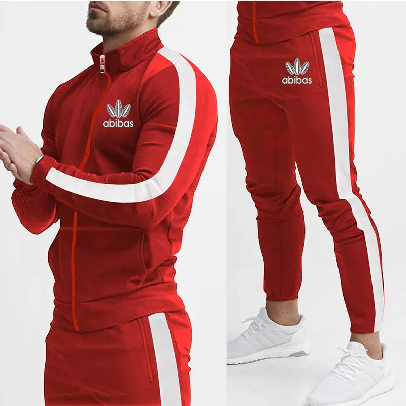 Spring And Autumn Men's Casual Sports Suit Striped Color-Matching Sportswear Stand Collar Zipper Jacket Trousers Two-piece Set