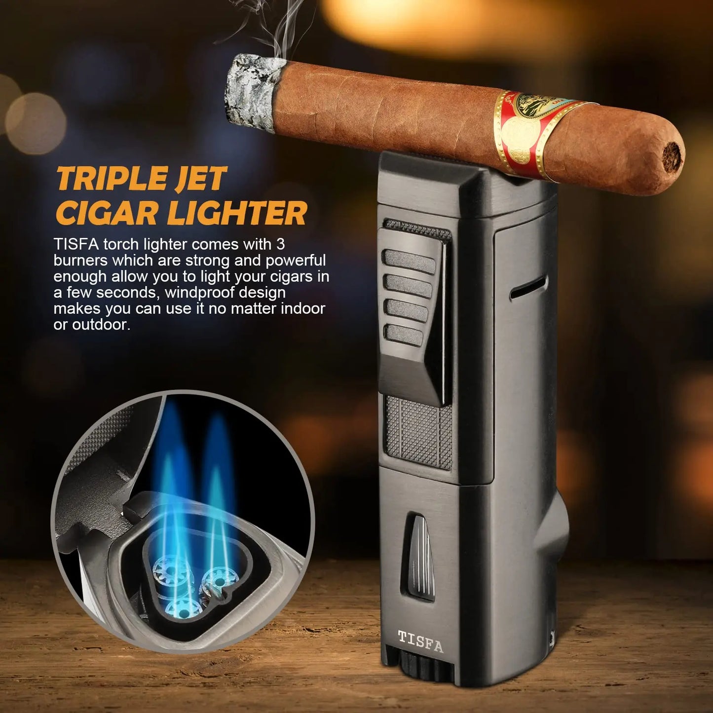[TRIPLE JET FLAME] TISFA torch lighter is made of premium ZINC ALLOY material,sturdy and durable. Our cigar lighters designed with 3 BURNERS,the firepower is strong enough to ignite your cigars quickly.The WINDPROOF design makes the torch lighter work well even in strong wind conditions,no need to worry about indoor or outdoor use.There is a LARGE FLAME ADJUSTMENT WHEEL at the bottom of the butane lighter,which can be easily adjusted without additional tools to meet your flame intensity needs.