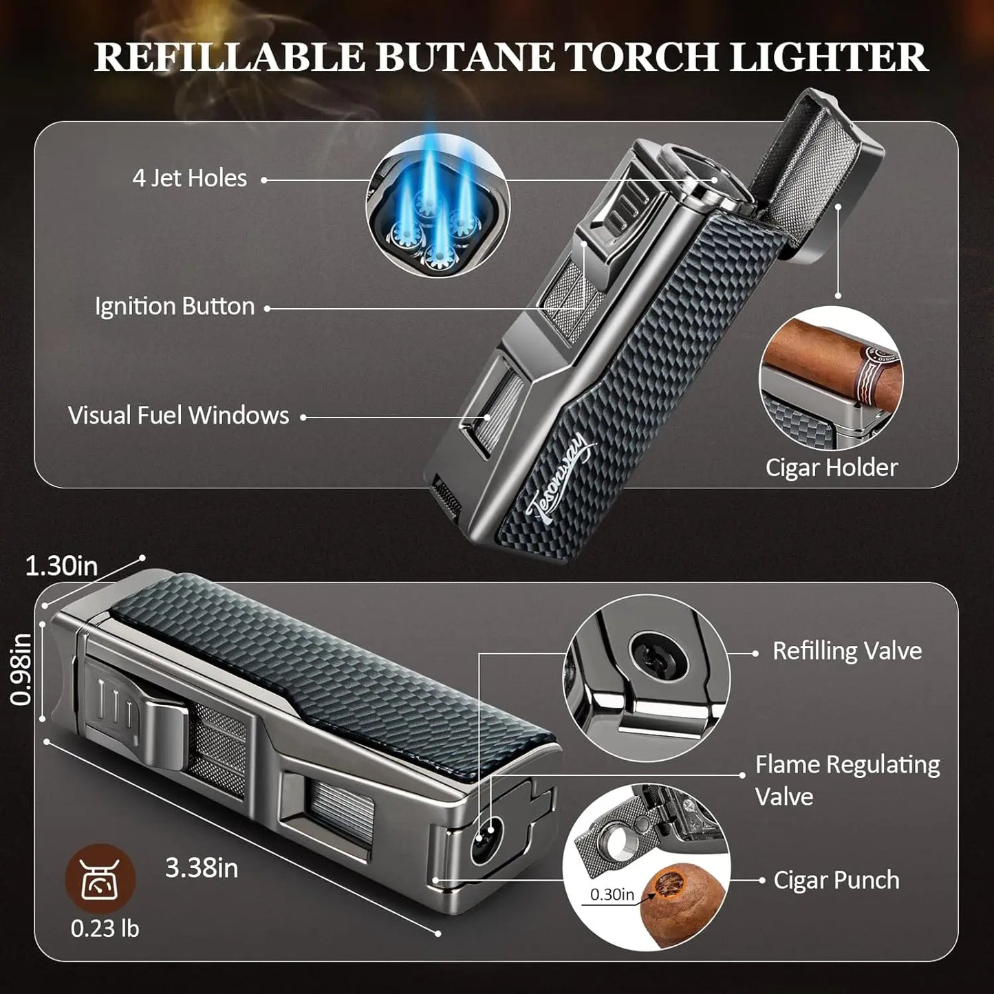 🔥【Multi-Function Cigar Torch Lighter】Powerful four-jet flame lighters, its top safety cover is cleverly designed as a cigar holder to hold your cigar securely. The body has a visual fuel window to monitor the fuel level, a folding cigar punch at the bottom for fast and sharp cigar punching, and a flame adjustment valve to adjust the flame size to meet your needs in all aspects. (Note: Lighter does not contain butane)